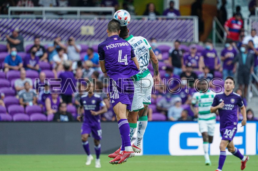 Orlando, Florida, USA, August 12, 2021, Santos Laguna and Orlando City SC players fight for the header at Exploria Stadium. (Photo Credit: Marty Jean-Louis)