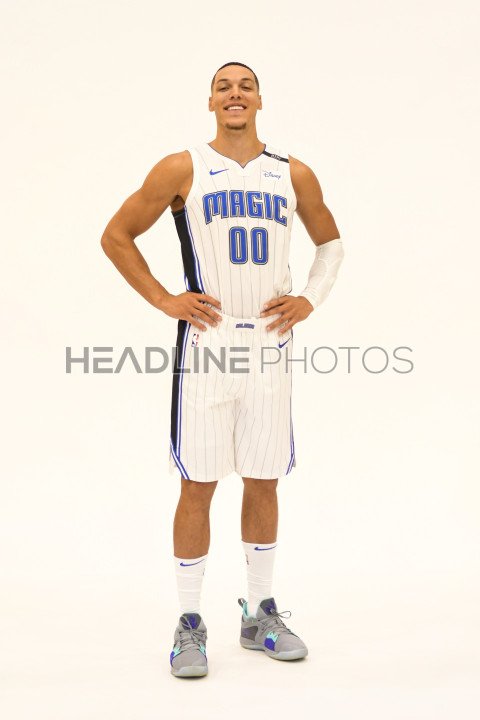 Aaron Gordon posing for photos during Media day at the Amway Center in Orlando, Florida. Photo Credit: Marty Jean-Louis
