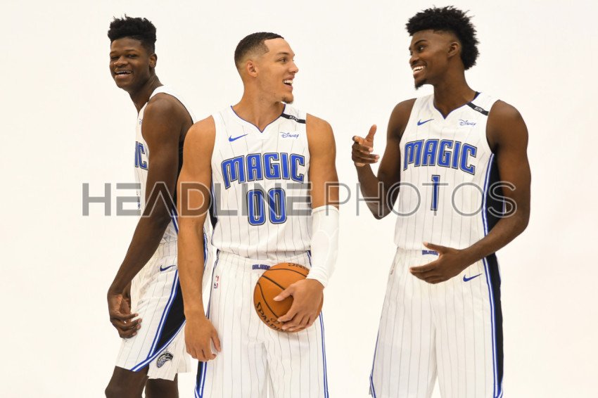 (left to right) Mohamed Bamba, Aaron Gordon and Jonathan Isaac posing for photos during Media day at the Amway Center in Orlando, Florida. Photo Credit: Marty Jean-LouisPhoto Credit: Marty Jean-Louis