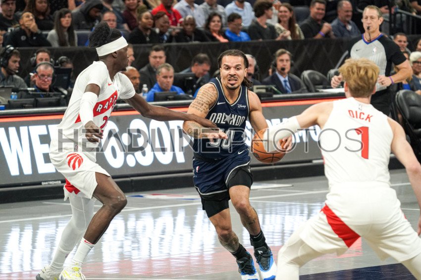 Orlando, Florida, USA, November 21, 2023, Orlando Magic guard Cole Anthony #50 runs pass Toronto Raptors players at the Amway Center. (Photo Credit: Marty Jean-Louis)