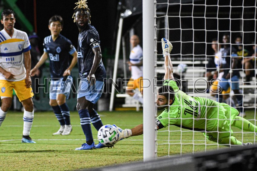 Vancouver Whitecaps Goalkeeper Crépeau, Maxime #16 makes a jump to try to catch the ball during the MLS is Back Tournament at ESPN Wild World of Sports in Orlando Florida on Wednesday July 15, 2020. Photo Credit: Marty Jean-Louis