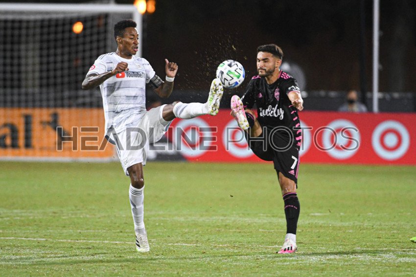 Seattle Sounders FC midfielder Roldan, Cristian #7 and Los Angeles Football Club midfielder Kaye, Mark-Anthony #14 fight for the ball during the MLS is Back Tournament at ESPN Wild World of Sports in Orlando Florida on Monday July 27, 2020. Photo Credit: Marty Jean-Louis