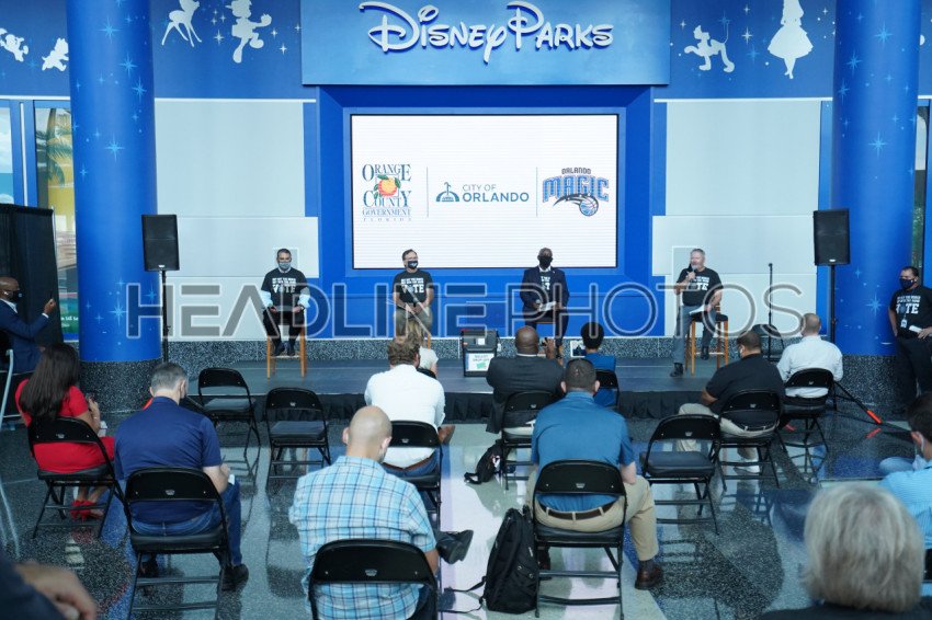 Orlando Magic CEO Alex Martins, Orange County Supervisor of Elections Bill Cowles, Orange County Mayor Jerry Demings, City of Orlando Mayor Buddy Dyer, announces Amway Center to open as early voting site for Orange County voters at the amway center in Orlando Florida USA on Wednesday September 2, 2020. Photo Credit: Marty Jean-Louis