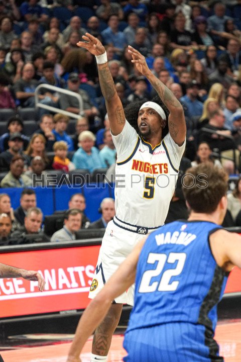 Orlando, Florida, USA, November 22, 2023, Denver Nuggets guard Kentavious Caldwell-Pope #5 shoots a three at the Amway Center. (Photo Credit: Marty Jean-Louis)