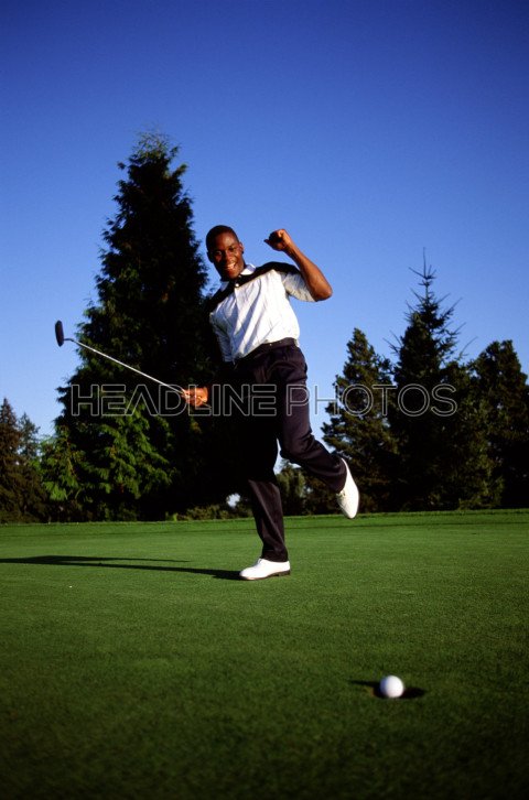 cheerful cheering clear sky copy space ecstatic excitement full length golf club golf course grass grass area green golf course happiness holding human arm human body part human limb human mouth joy laughing legs apartSimilar Photos