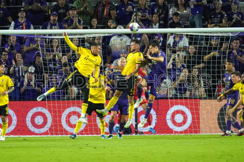 Orlando, Florida, USA, November 25, 2023, Columbus Crew defender Rudy Camacho #4 defends the ball with a header in the first half at Exploria Stadium. (Photo Credit: Marty Jean-Louis)