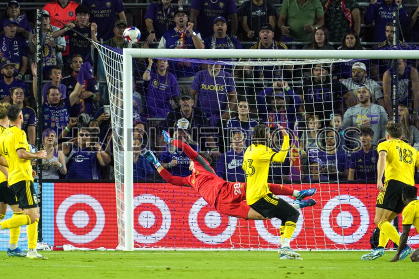 Orlando, Florida, USA, November 25, 2023, Columbus Crew goalkeeper Patrick Schulte #28 attempt to make a save at Exploria Stadium. (Photo Credit: Marty Jean-Louis)