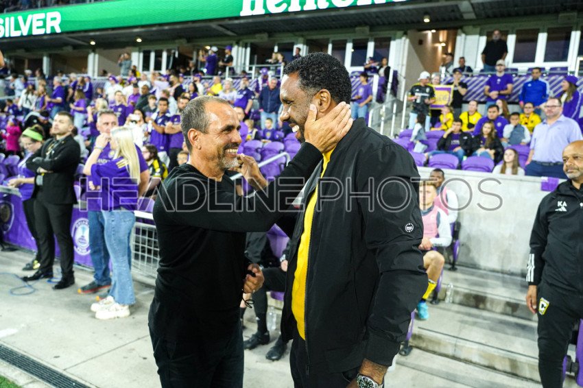 Orlando, Florida, USA, November 25, 2023, Orlando City SC head Coach Oscar Pareja Gomez and Columbus Crew Head coach Wilfried Nancy share some words before the match at Exploria Stadium. (Photo Credit: Marty Jean-Louis)