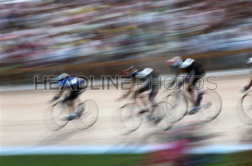 Abstract blur of professional cyclists speeding around a velodrome curve