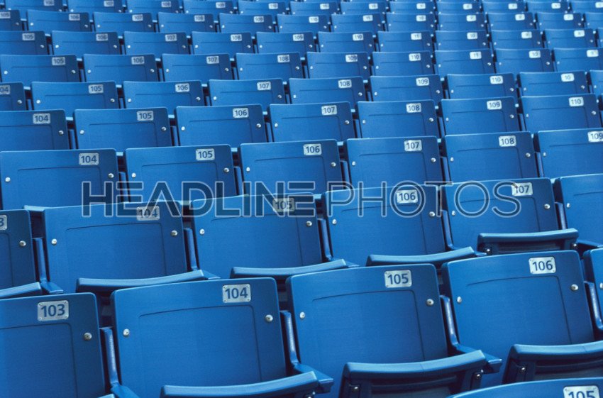 An empty blue arena seats with numbers