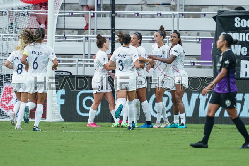 Orlando, Florida, USA, July 4, 2021, North Carolina Courage players celebrate goal against the Orlando Pride at Exploria Stadium. (Photo Credit: Marty Jean-Louis)
