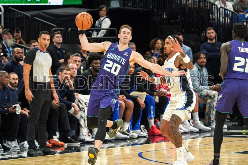 Orlando, Florida, USA, November 26, 2023, Charlotte Hornets forward Gordon Hayward #20 readies to make a pass at the Amway Center. (Photo Credit: Marty Jean-Louis)