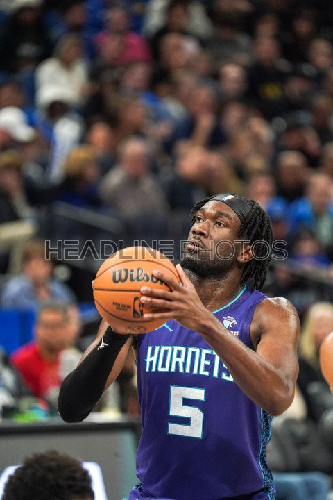Orlando, Florida, USA, November 26, 2023, Charlotte Hornets center Mark Williams #5 shoots a free throw in the second half at the Amway Center. (Photo Credit: Marty Jean-Louis)
