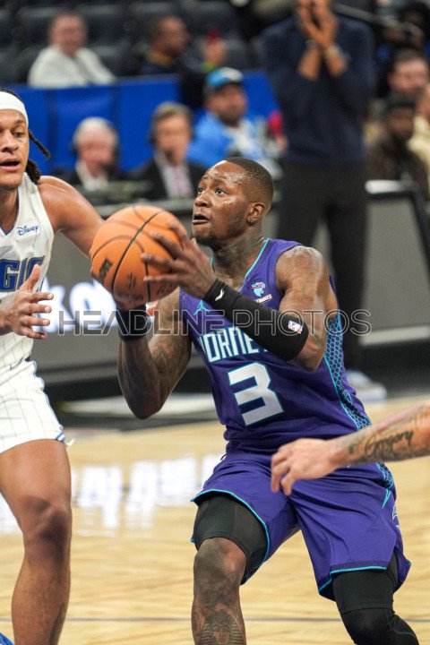 Orlando, Florida, USA, November 26, 2023, Charlotte Hornets guard Terry Rozier #3 attempt to score at the Amway Center. (Photo Credit: Marty Jean-Louis)