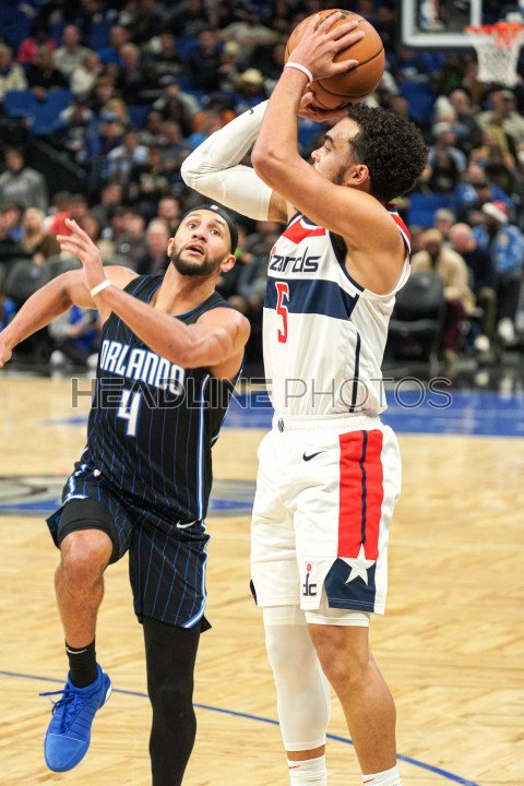 Orlando, Florida, USA, November 29, 2023, Washington Wizards guard Tyus Jones #5 takes a shot during the second half at the Amway Center. (Photo Credit: Marty Jean-Louis)