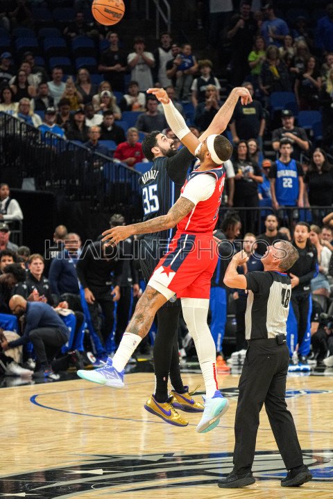 Orlando, Florida, USA, November 29, 2023, Washington Wizards player Daniel Gafford #21 and Orlando Magic player Goga Bitadze #35 jump for the ball during the opening tip off at the Amway Center. (Photo Credit: Marty Jean-Louis)