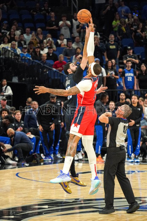Orlando, Florida, USA, November 29, 2023, Washington Wizards player Daniel Gafford #21 and Orlando Magic player Goga Bitadze #35 jump for the ball during the opening tip off at the Amway Center. (Photo Credit: Marty Jean-Louis)