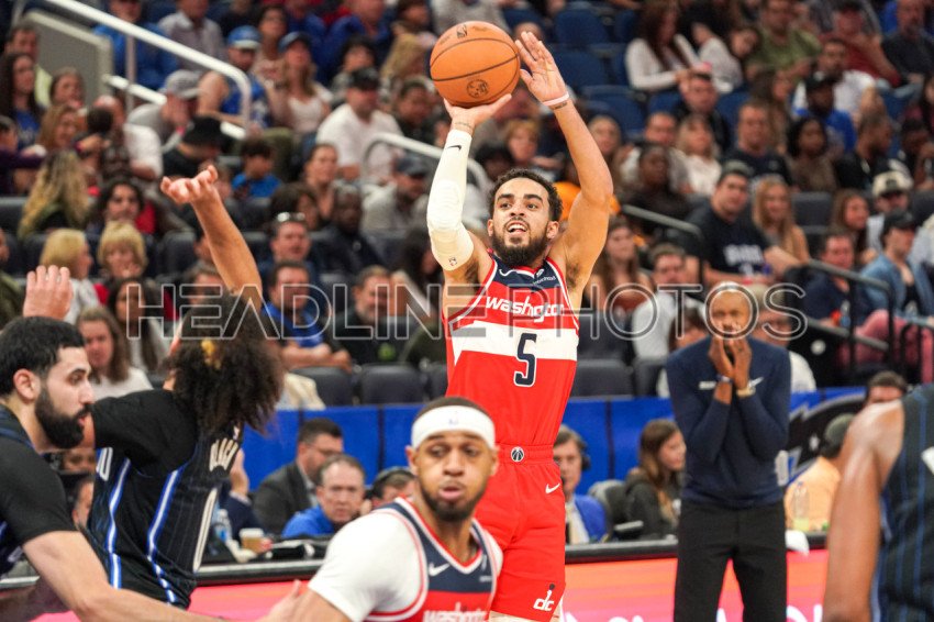 Orlando, Florida, USA, November 29, 2023, Washington Wizards guard Tyus Jones #5 shoots a three at the Amway Center. (Photo Credit: Marty Jean-Louis)