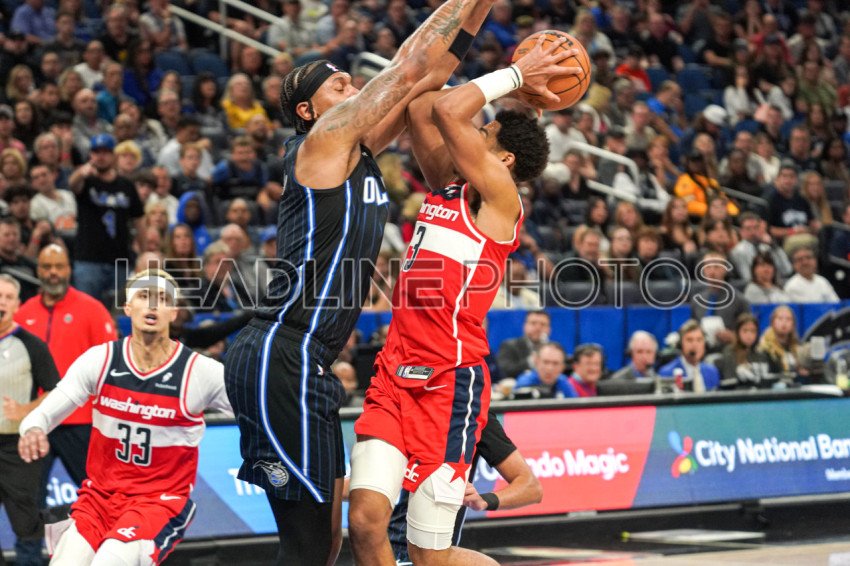 Orlando, Florida, USA, November 29, 2023, Washington Wizards guard Jordan Poole #13 attempt to score but is blocked by Paolo Banchero #5 at the Amway Center. (Photo Credit: Marty Jean-Louis)