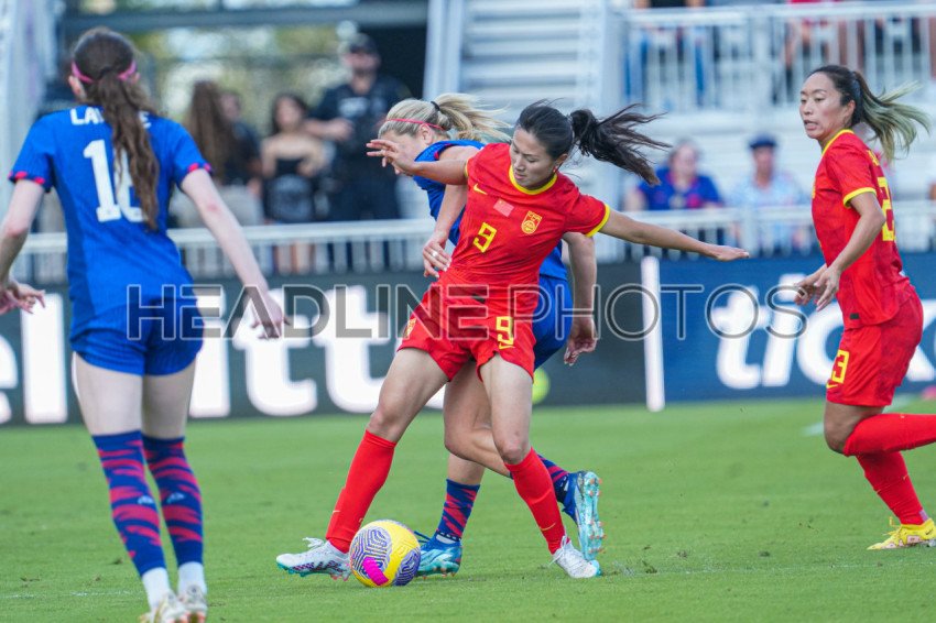 Fort Lauderdale, USA, December 2, 2023, China PR player Shen Mengyu #9 fight to keep the ball in a friendly match at DRV PNK Stadium. (Photo Credit: Marty Jean-Louis)