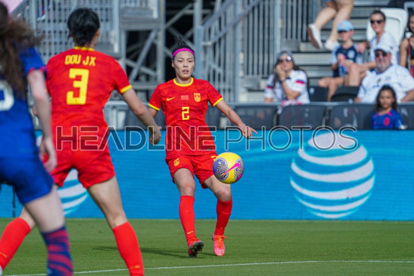 Fort Lauderdale, USA, December 2, 2023, China PR defender Li Mengwen #2 receives a pass in a friendly match at DRV PNK Stadium. (Photo Credit: Marty Jean-Louis)