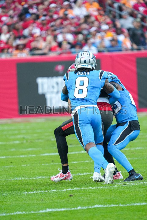 Tampa Bay, Florida, USA, December 3, 2023, Tampa Bay Buccaneers wide receiver Mike Evans #13 gets tackled by Jaycee Horn #8 at Raymond James Stadium. (Photo Credit: Marty Jean-Louis)
