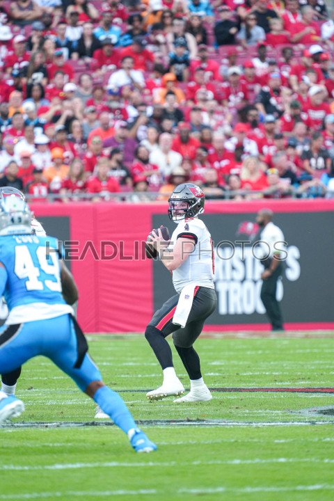 Tampa Bay, Florida, USA, December 3, 2023, Tampa Bay Buccaneers Quarterback Baker Mayfield #6 look to make a pass at Raymond James Stadium. (Photo Credit: Marty Jean-Louis)