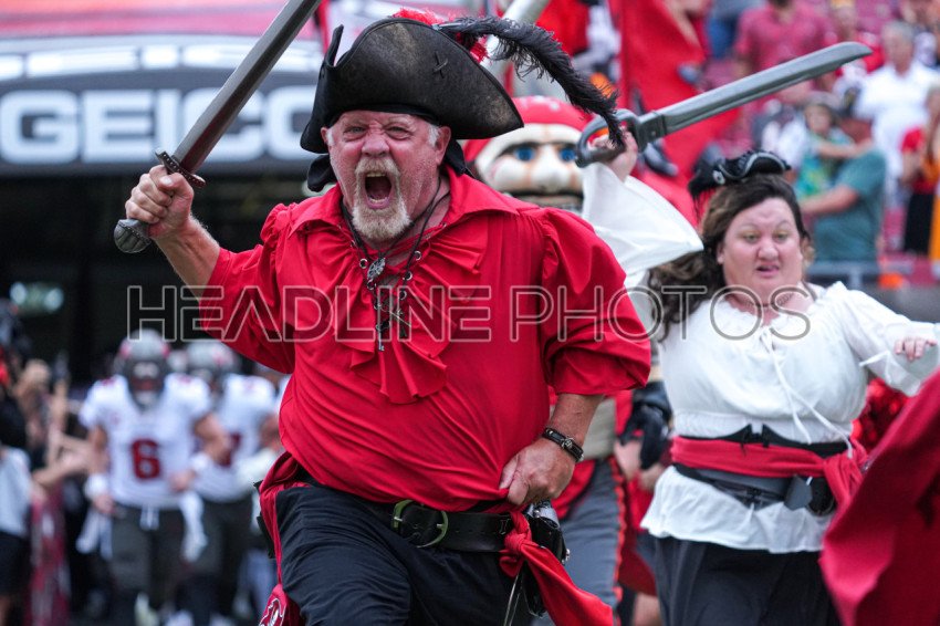 Tampa Bay, Florida, USA, December 3, 2023, Tampa Bay Buccaneers Pirates run to the field at Raymond James Stadium. (Photo Credit: Marty Jean-Louis)