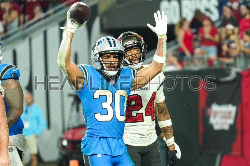 Tampa Bay, Florida, USA, December 3, 2023, Carolina Panthers player Chuba Hubbard #30 makes a touch down at Raymond James Stadium. (Photo Credit: Marty Jean-Louis)