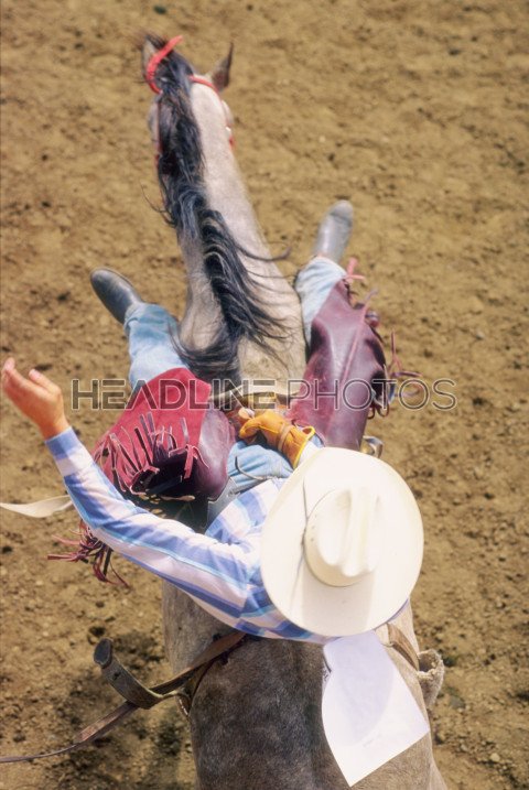 Blonde Rodeo Rider Balances Atop Horse Bucking Forward