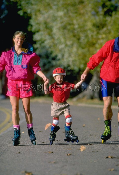 Young father and mother teaches, trains little baby in sports protection to roller skate in park.