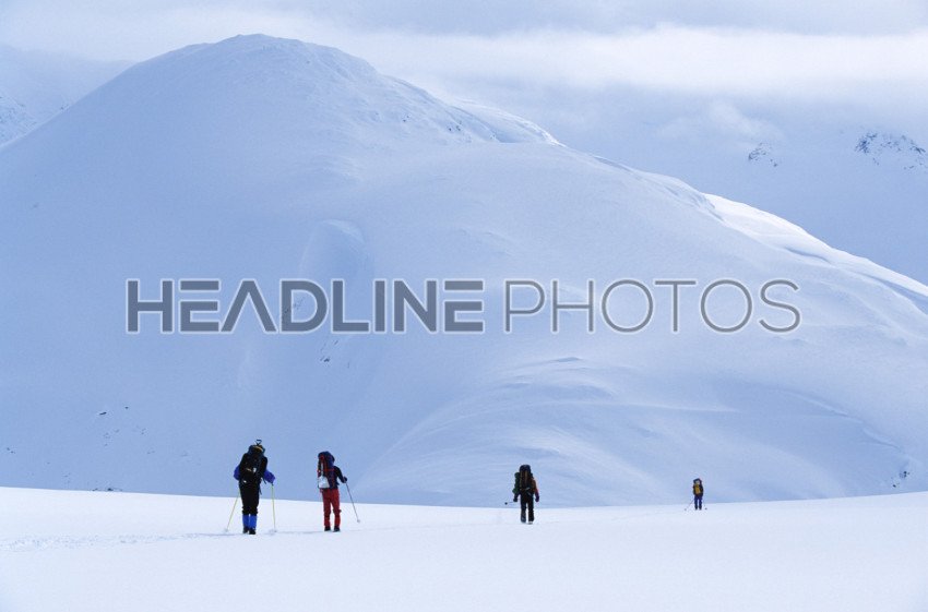 People ski touring beautiful vast white mountain side