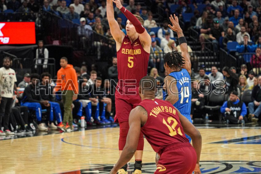Orlando, Florida, USA, December 11, 2023, Cleveland Cavaliers guard Sam Merrill #5 shoots a three at the Amway Center. (Photo Credit: Marty Jean-Louis)