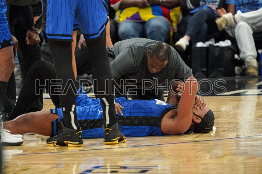 Orlando, Florida, USA, December 11, 2023, Orlando Magic forward Paolo Banchero #5 on the floor in pain after being injured in the second half at the Amway Center. (Photo Credit: Marty Jean-Louis)