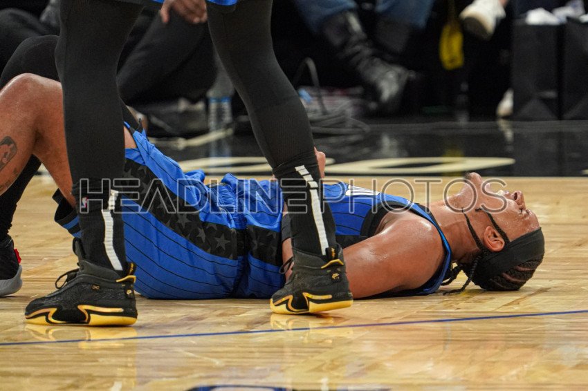 Orlando, Florida, USA, December 11, 2023, Orlando Magic forward Paolo Banchero #5 on the floor in pain after being injured in the second half at the Amway Center. (Photo Credit: Marty Jean-Louis)