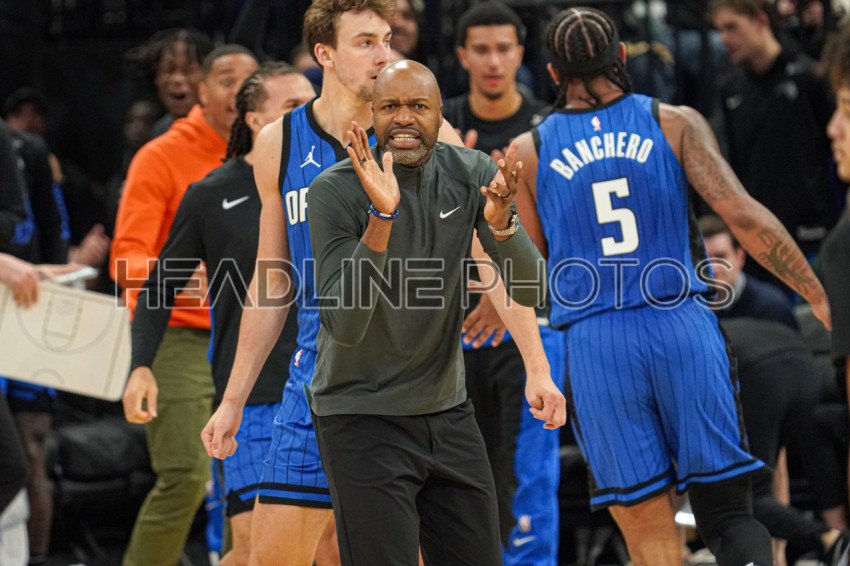Orlando, Florida, USA, December 11, 2023, Orlando Magic head coach Jamahl Mosley motivates the players during a time out session at the Amway Center. (Photo Credit: Marty Jean-Louis)