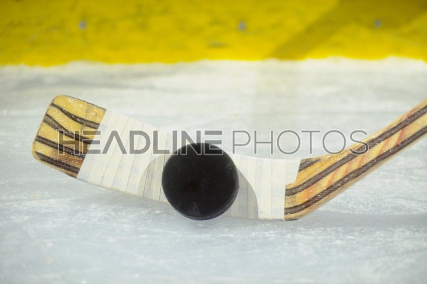 Hockey puck and stick on the ice texture background