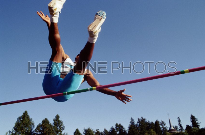 Fitness athletics high jump by man at a stadium for training energy and cardio against sky background jumping