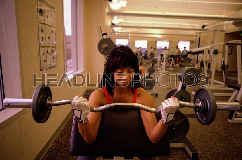 Mid adult woman in gym doing pectoral exercise