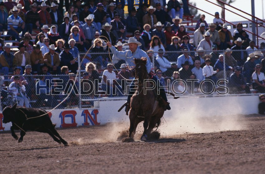 A cowboy swings a lariat while his speedy horse gives chase to a calf during the tie-down roping contest at the annual Sisters Rodeo near Bend
