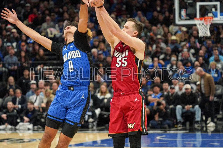 Orlando, Florida, USA, December 20, 2023, Miami Heat guard Duncan Robinson #55 shoots a three as Anthony Black #0 attempt to block at the Amway Center. (Photo Credit: Marty Jean-Louis)