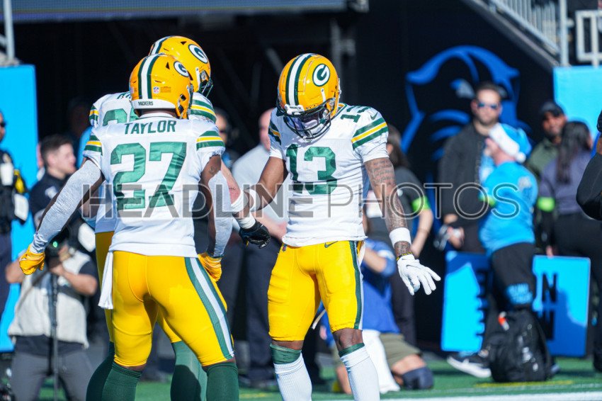 Charlotte, North Carolina, USA, December 24, 2023, Green Bay Packers wide receiver Dontayvion Wicks #13 celebrate after making a touchdown in the first half at Bank of America Stadium. (Photo Credit: Marty Jean-Louis)
