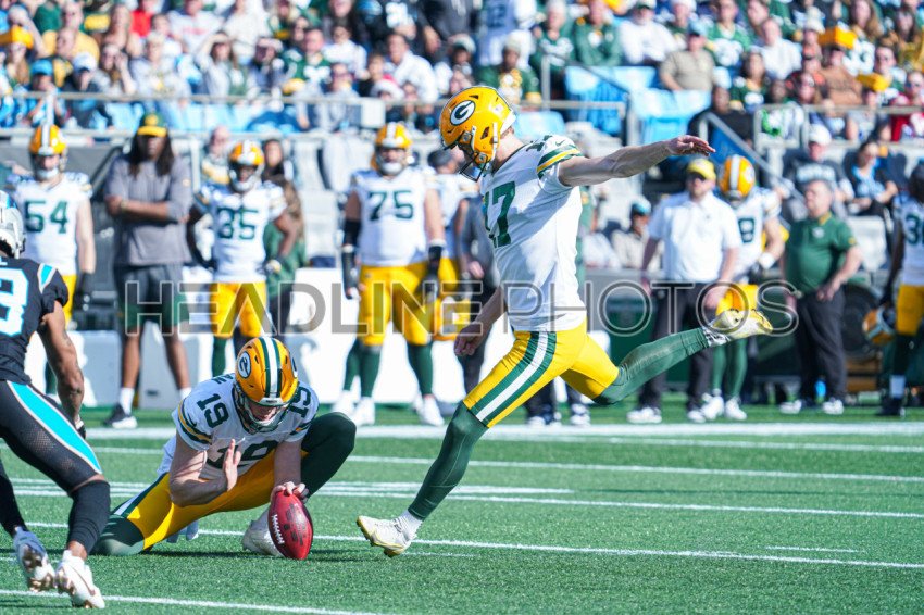 Charlotte, North Carolina, USA, December 24, 2023, Green Bay Packers Punter Daniel Whelan holds the ball for the kick by Anders Carlson #17 at Bank of America Stadium. (Photo Credit: Marty Jean-Louis)
