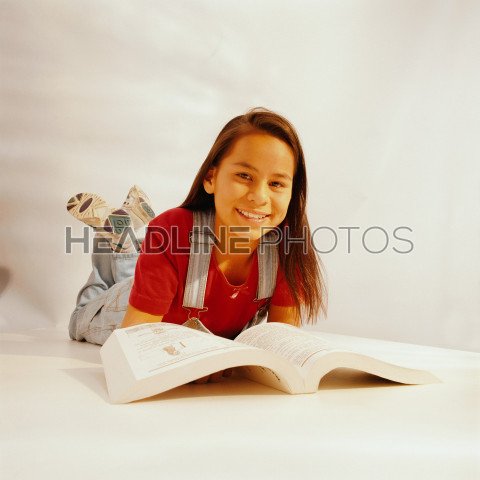 Girl laying on bed reading book
