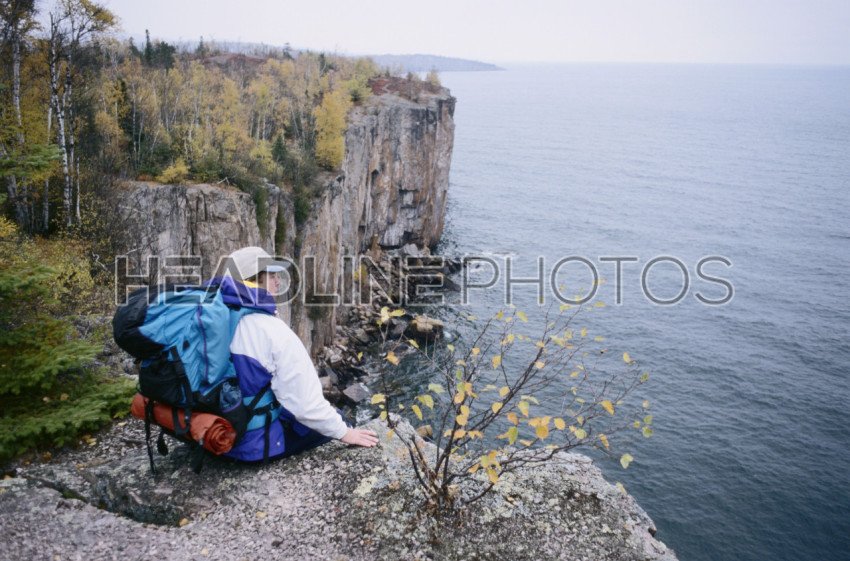 Single Man Sits on a Rocky Shore Taking in the Spectacular Views of Lake Superior