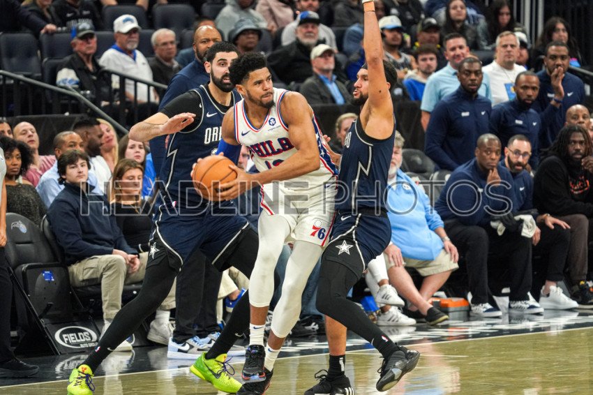 Orlando, Florida, USA, December 27, 2023, Philadelphia 76ers forward Tobias Harris is doubled teamed (Goga Bitadze #35 and Jalen Suggs #4) during the fourth quarter at the Amway Center. (Photo Credit: Marty Jean-Louis)