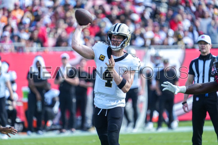Tampa Bay, Florida, USA, December 31, 2023, New Orleans Saints quarterback Derek Carr #4 make a pass at Raymond James Stadium. (Photo Credit: Marty Jean-Louis)