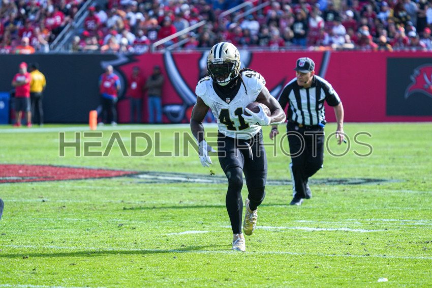 Tampa Bay, Florida, USA, December 31, 2023, New Orleans Saints player Alvin Kamara #41 makes a run at Raymond James Stadium. (Photo Credit: Marty Jean-Louis)