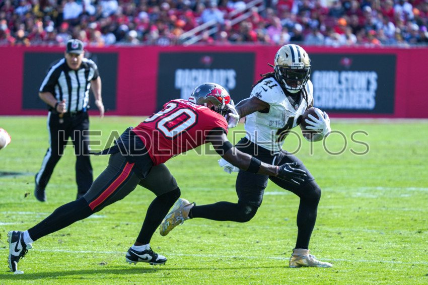 Tampa Bay, Florida, USA, December 31, 2023, New Orleans Saints player Alvin Kamara #41 makes a run at Raymond James Stadium. (Photo Credit: Marty Jean-Louis)