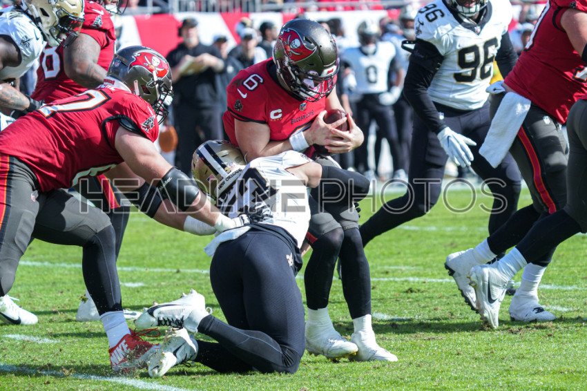 Tampa Bay, Florida, USA, December 31, 2023, Tampa Bay Buccaneers quarterback Baker Mayfield #6 gets tacked by Zack Baun #53 at Raymond James Stadium. (Photo Credit: Marty Jean-Louis)